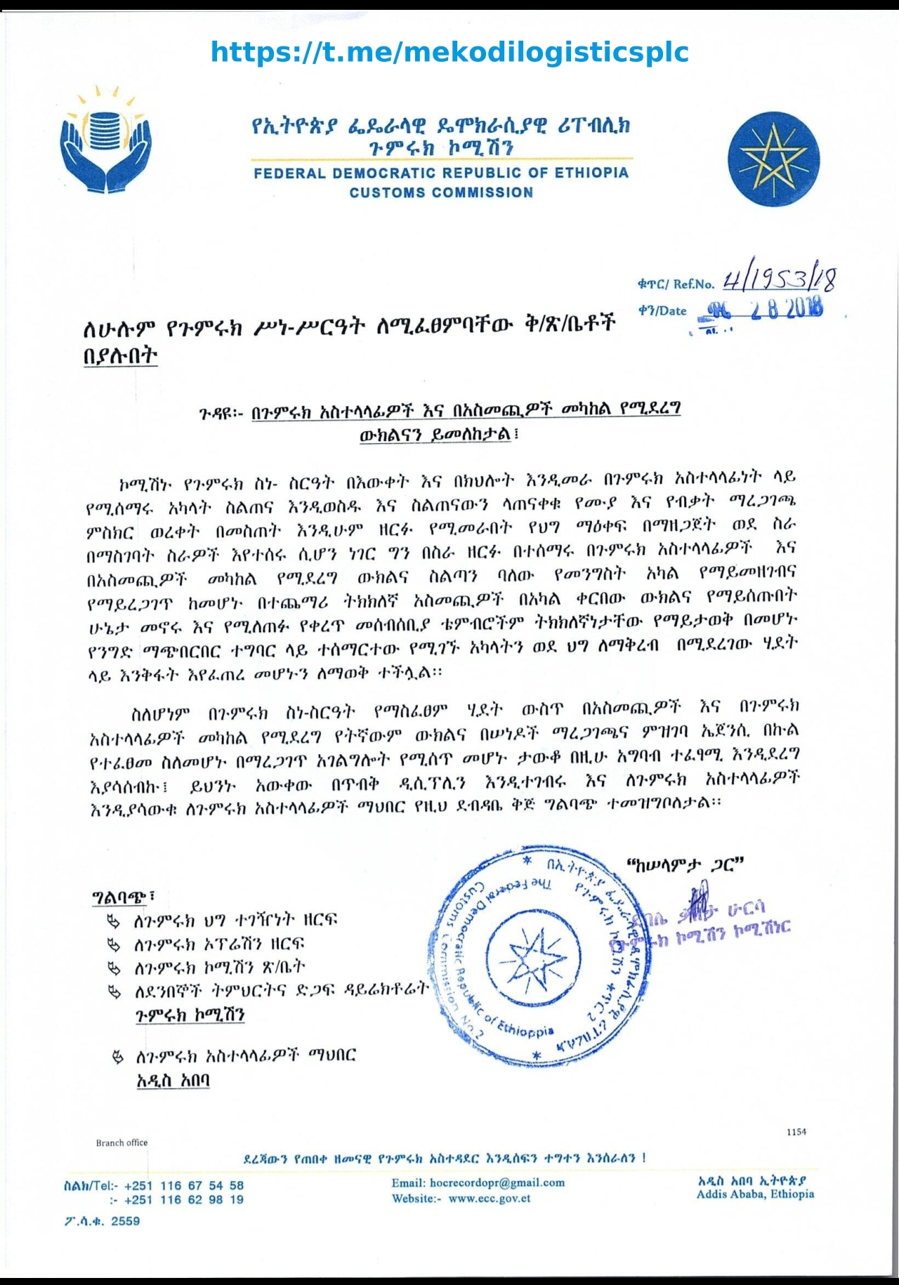 The Ethiopia Customs Commission has issued a formal directive regulating representation between importers and customs brokers during customs clearance. The Commission stated that many existing representations are unregistered and unverified by authorized government bodies, with some importers not appearing in person and the authenticity of tax collection stamps unclear.