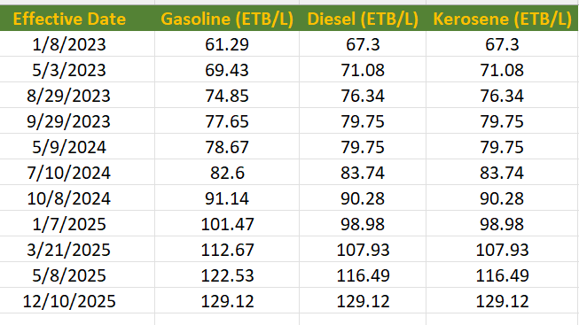 The turning point came in late 2024. A sharp rise in October 2024, which pushed gasoline above 91 birr per litre, was followed by a rapid succession of adjustments in January, March and May 2025. Within five months, gasoline climbed from 101 birr to 123 birr per litre, while diesel rose from 99 birr to 116 birr. The final adjustment in December 2025, which unified prices at 129 birr, cemented a new, higher plateau.
