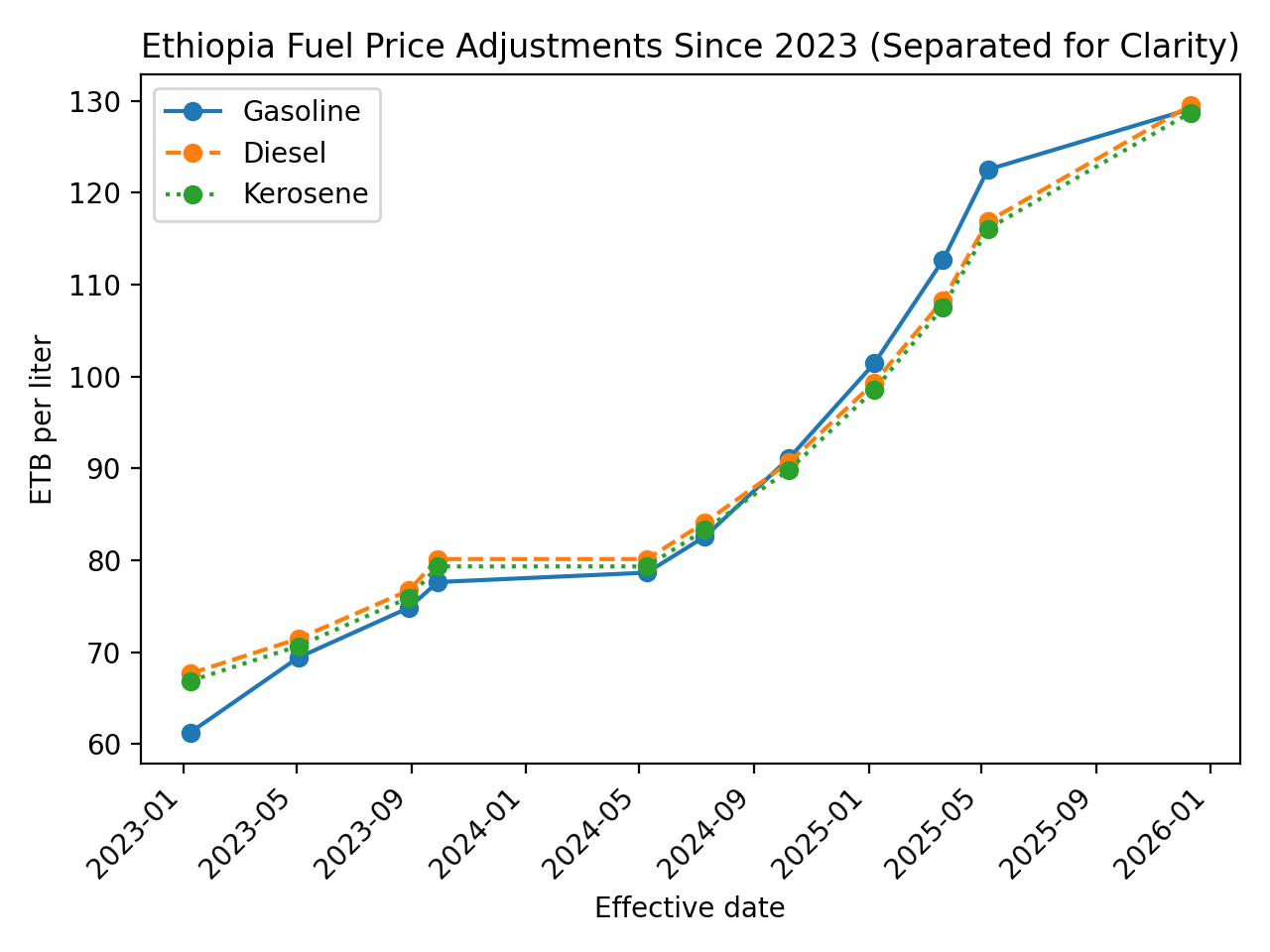 In January 2023, gasoline sold at 61 birr per litre, while diesel and kerosene stood at 67 birr. By December 2025, all three fuels had converged at 129 birr per litre, representing an increase of more than 100 per cent for gasoline and almost 92 per cent for diesel and kerosene in less than three years. Few other policy-adjusted prices have moved as decisively, or with such economy-wide consequences.