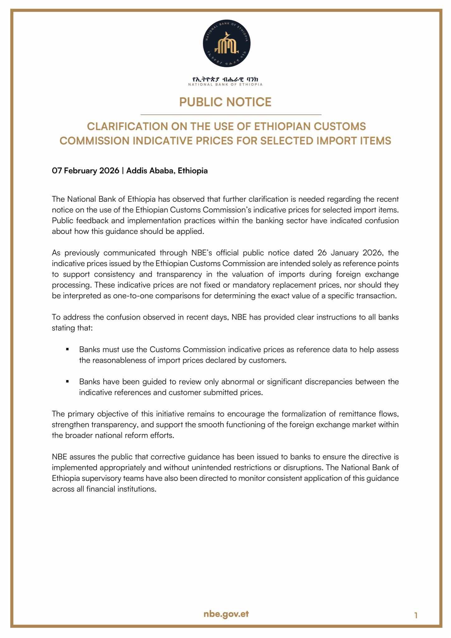 National Bank of Ethiopia issued a public notice on 7 February 2026 clarifying the use of Ethiopian Customs Commission indicative prices for selected import items during foreign exchange processing.
